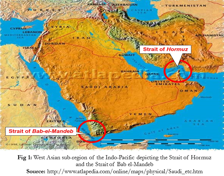 Within the West Asian sub-region of the Indo-Pacific, the Strait of Hormuz (connecting the Persian Gulf and the Gulf of Oman) and the Strait of Bab el-Mandeb (connecting the Gulf of Aden and the Red Sea), both of which are depicted in Figure 1, are the two most critical passageways for a substantial percentage of the world’s oil trade.