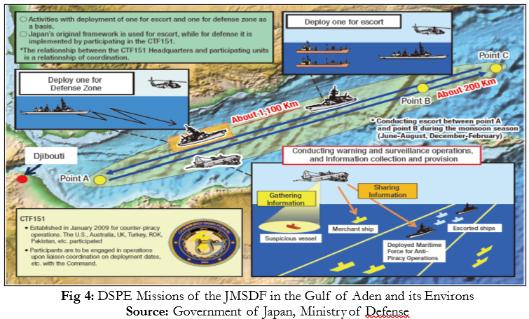Insofar as surface deployments of the JMSDF are concerned, these are collectively known as DSPE (Deployment of Surface Force for Counter-Piracy Enforcement) missions.[10]  These missions involve JMSDF warships on two basic forms of tasking: the first of these is the direct escort of merchant ships across the Gulf of Aden, while the second is through deployments within a specified ‘box’ or zone within the Internationally Recognised Transit Corridor, under the aegis of CTF-151.[11]   The JMSDF’s DSPE missions began in March 2009, after approval had been received from the Cabinet under the provisions of Article 82 of the Self-Defense Forces Act.  In July 2009, the “Act concerning the Punishment of Acts of Piracy and Measures to Deal with Acts of Piracy”[12] was enacted, enabling the JMSDF “to protect the vessels of all nations from acts of piracy”.[13]  It is important to bear in mind that in both cases, the ‘Rules of Engagement’ (RoE) to be followed by the JMSDF warships are those laid down by Tokyo.  In other words, once the JMSDF warship has taken up position in its assigned zonal-defence ‘box’ Tokyo — and NOT the CTF-151 — decides (through its promulgated RoE) which actions are permissible to be undertaken by the JMSDF vessel in question, and which are not.  The JMSDF-DSPE is pictorially depicted in Figure 4.[14]