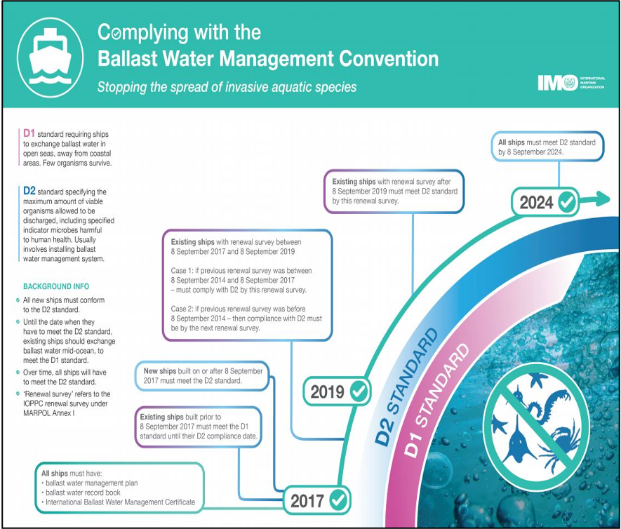 - “D2 Standard”. The “D2 Standard” (as amended by the 72nd session of the Marine Environment Protection Committee [MEPC 72]) focuses upon the performance of ballast water in terms of its chemical composition and the presence of organisms. To comply with the D2 standard, ships need to obtain a report from an accredited laboratory, confirming compliance with D2 Ballast Water Performance Testing. The aim of this standard is to establish acceptable levels of organisms present in discharged ballast water. The acceptable levels include: