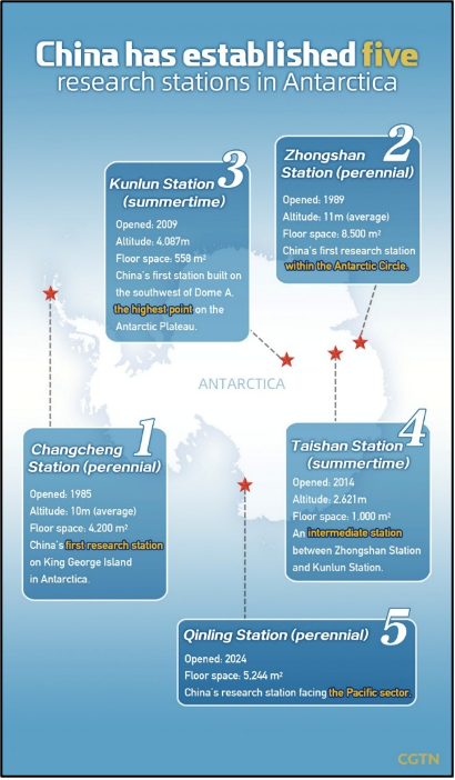Proposed 6th Station. In early 2025, China forwarded a draft environmental evaluation request to the Secretariat of the Antarctic Treaty for the construction and operation of a new summer research station at Marie Byrd Land, West Antarctica. The matter is scheduled to come up for discussion during the next Antarctic Treaty Consultative Meeting scheduled to be held in Italy in June 2025. The base will have a main building of 900 square meters and a scientific research centre of 500 square meters. It will be capable of accommodating 25 researchers and support staff in summers. It is expected to be operational by 2027.