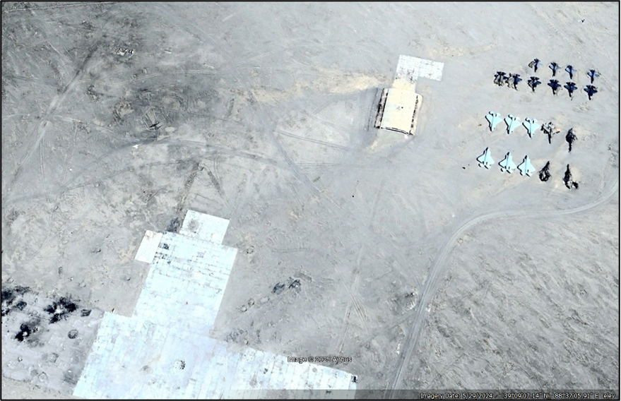 - Ford Class Aircraft Carrier. This target replaced models of smaller ships at the same location in 2023. With a length of 337 meters and with the island placed well aft, it is a near replica of the deck of USS Ford. The radar characteristics of the island is simulated by poles with reflectors. The google earth image dated 24 May 22024 shows the model partially covered by sand, possibly due to a sand storm.