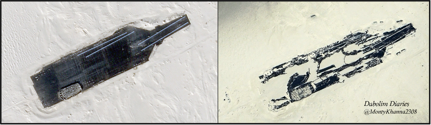 The apron to the East along with its intersection with the runway is used as a target area. It is possible that the remaining part of the runway along with the second apron is serviceable for use by aircraft.