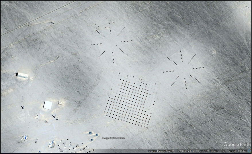 Just to the south is what appears to be another square shaped target in which reflectors appear to be distributed in a random manner. Lattice towers are visible near all the targets most likely for receiving telemetry data.