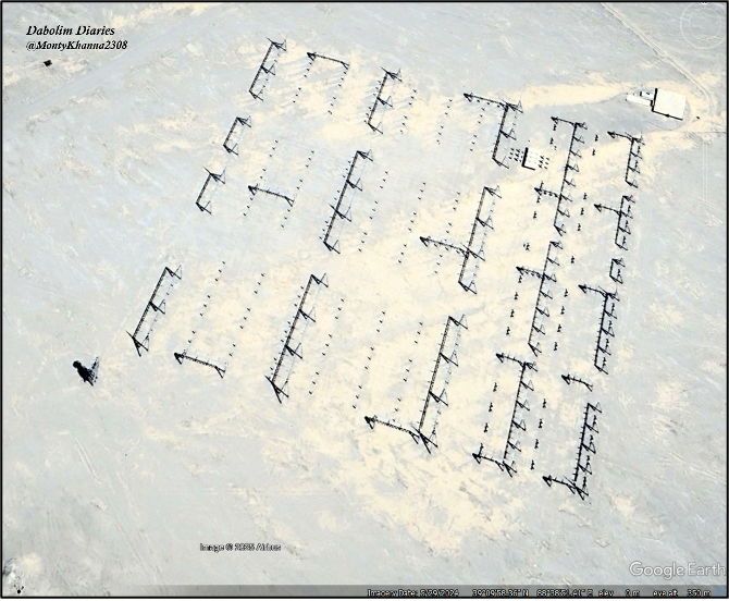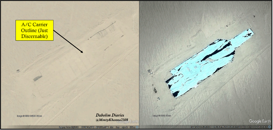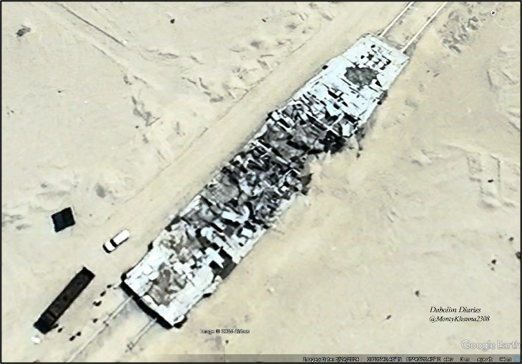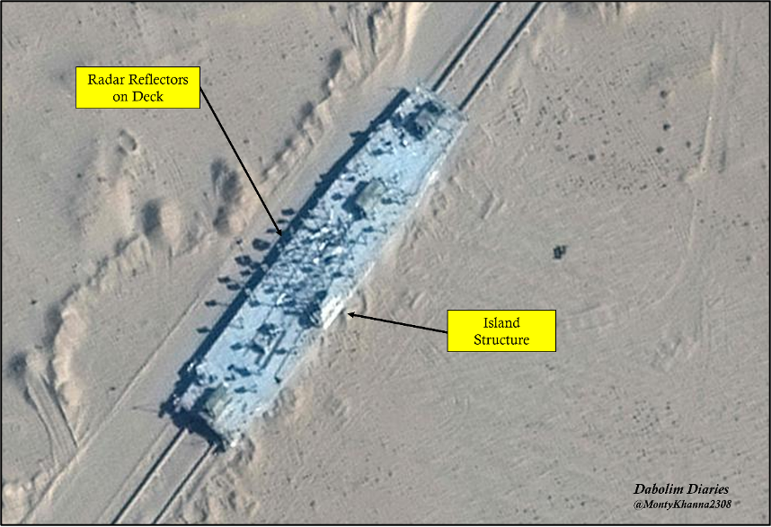 - Ford Class Aircraft Carrier. This target replaced models of smaller ships at the same location in 2023. With a length of 337 meters and with the island placed well aft, it is a near replica of the deck of USS Ford. The radar characteristics of the island is simulated by poles with reflectors. The google earth image dated 24 May 22024 shows the model partially covered by sand, possibly due to a sand storm.