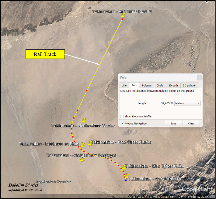 Mobile Target Rail System. This facility was built in the early 2020s. It comprises of a 37.6 km long rail system with a gauge of 12.5 meters. The northern end of the rail system ends in a building complex with a large covered shed which is probably used for fabricating/repairing the mobile targets that traverse on the rails. The southern end terminates without any conspicuous structures, possibly allowing for its extension at a later date.