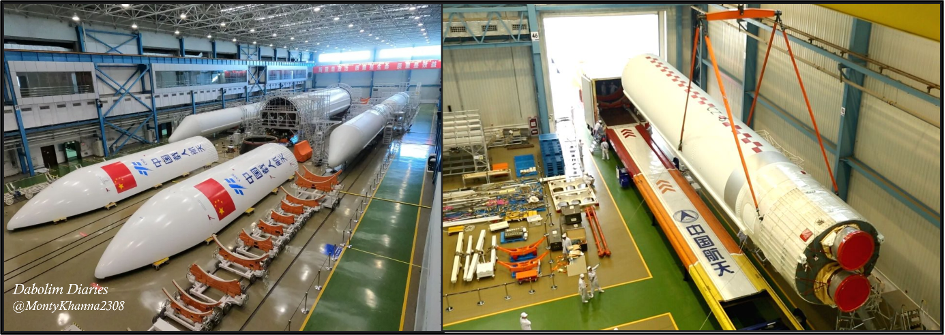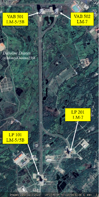 When constructed, the SLC comprised of two Vehicle Assembly Buildings (VABs), ‘501’ for Long March-5/5B rockets and ‘502’ for Long March-7 rockets. The buildings are similar in design with minor differences in height, ‘501’ being 99.4 m and ‘502’ being 96.6 m in height. Once fully assembled and made ready for launch, rockets are transported vertically to their respective launch pads (‘101’ for Long March-5/5B and ‘201’ for Long March-7) on Mobile Launch Platforms (MLPs) that run for a distance of about 2,800 m on 20 m wide rails. This process is understood to take about three hours. The launch pads comprise of a fixed umbilical tower, underground flame deflector trenches with ducts, and four lightning rods.