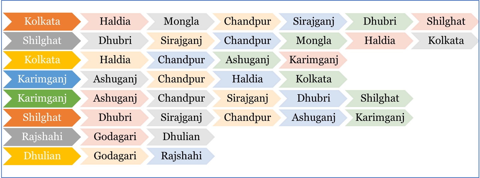 The India-Bangladesh Protocol Routes include parts of rivers Ganga, Hooghly, Brahmaputra, and Barak, and the Sundarbans delta (Fig.1). The key routes are indicated in Fig.2.