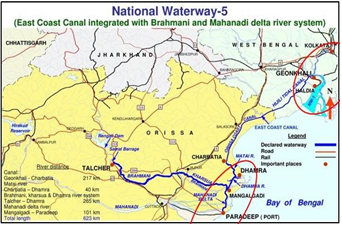 The NW5, declared in 2008, stretches along the Brahmani and Mahanadi delta system connecting the ports of Goenkhali in West Bengal with Paradip in Odisha, through the Hijli Tidal Canal and Odisha Tidal canal (Fig.5). To maintain a navigable depth of two metre, five barrages with navigation locks have been proposed to allow passage of two 500 tonne vessels simultaneously.