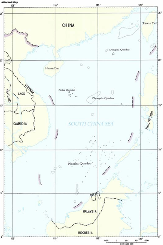 “China has indisputable sovereignty over the islands in the South China Sea and the adjacent waters, and enjoys sovereign rights and jurisdiction over the relevant waters as well as the seabed and subsoil thereof (see attached map). The above position is consistently held by the Chinese government and is widely known by the international community.”