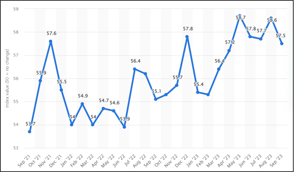 [8] Statista, “India: Purchasing Managers’ Index (PMI) from September 2021 to September 2023,” n.d., https://www.statista.com/statistics/275297/purchasing-managers-index-pmi-in-india/.