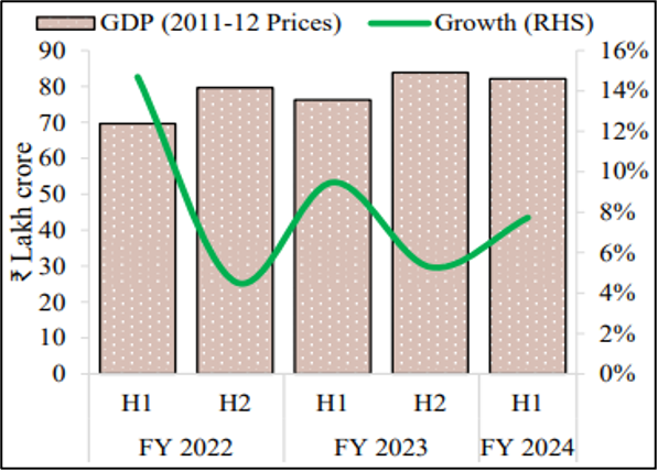 As per the Half-yearly Economic Review [[6]], of November 2023, India’s GDP grew by 7.7 per cent in H1 of FY 24 (Apr-Sep 23). Supply chains eased, global inflation declined, and Advanced Economies (AEs) showed resilience. The government of India’s measures have moderated due to stable and declining core inflation. The Government’s capital expenditure has accelerated the investment rate. Prudent fiscal policies amidst the fiscal risks prevailing globally are supporting the country’s economic growth prospects. As a result of this macroeconomic stability, India is expected to grow at 7.3 per cent [[7]] during the current fiscal year.