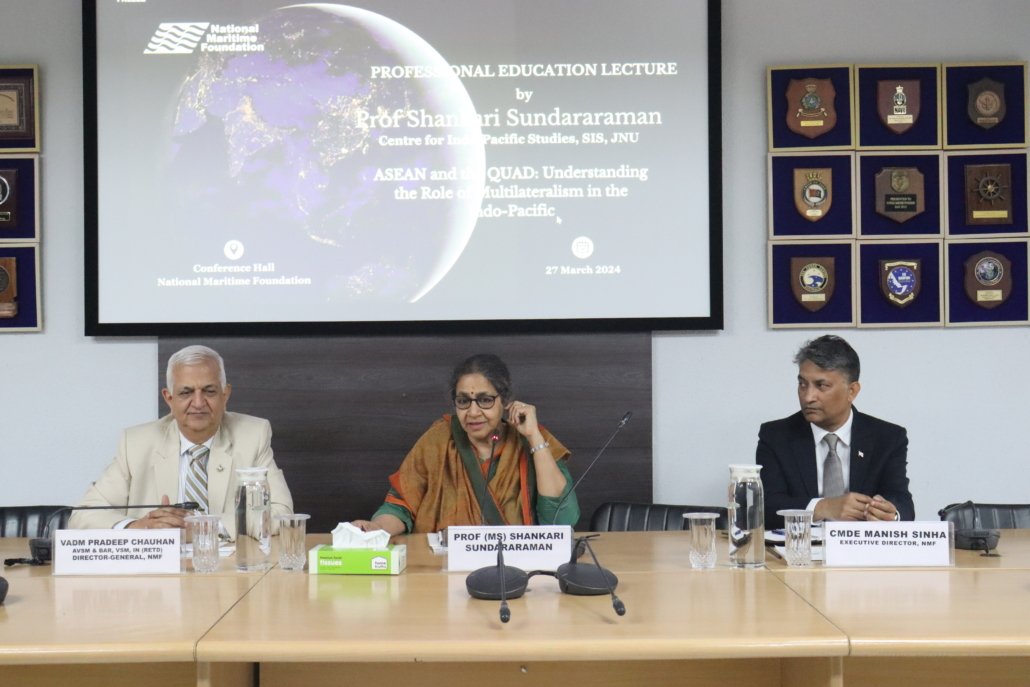 Prof Shankari Sundararaman delivered the Professional Education Lecture (PEL) on ‘ASEAN and QUAD: Understanding the Role of Multilateralism in the Indo-Pacific’ at the National Maritime Foundation (NMF), New Delhi, on Wednesday, 27 March 2024. The Session was chaired by the Director-General of the NMF, Vice Admiral Pradeep Chauhan, AVSM & Bar, VSM, IN (Retd), who delivered the opening remarks.