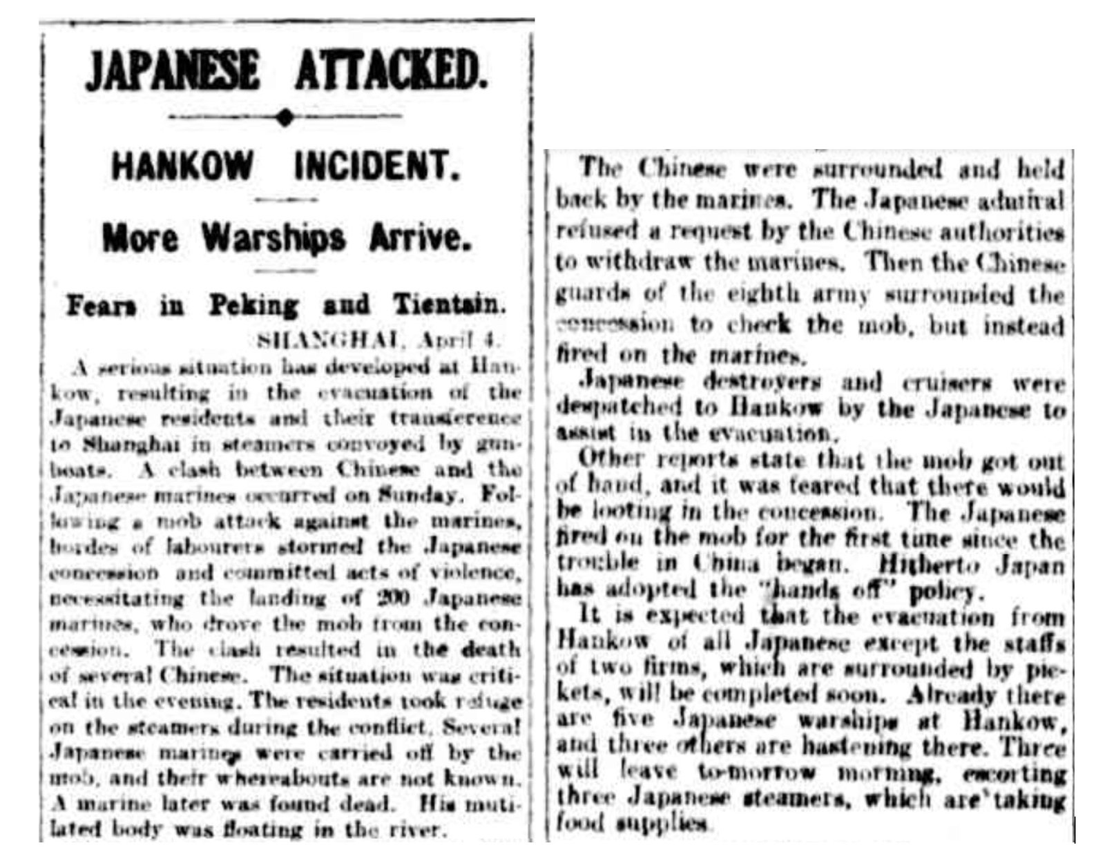 During this period of Japanese occupation in China, one of the first incidents that led to a Japanese “hands-on” policy was the Hankou Incident, which took place on 03 April 1927. Clashes between Japanese marines and the locals led to a mob attack against the Japanese Concession. This resulted in the deployment of 200 Japanese marines to maintain order and safeguard the Concession. This was then followed by Chinese guards firing at the marines instead of the mob, leading to the Japanese marines firing at the uncontrolled mob. Shortly thereafter, the Japanese were evacuated from Hankou. Images 1 and 2 below narrate the details of the incident.