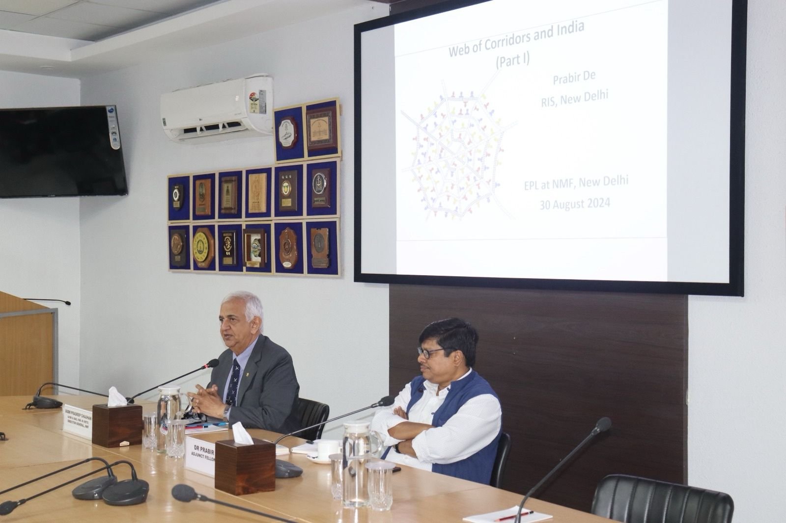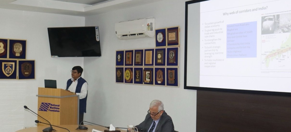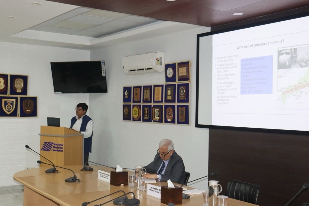 On Friday, 30 August 2024, the National Maritime Foundation (NMF) organised a Professional Education Lecture (PEL) by Dr Prabir De, Adjunct Fellow at NMF and Professor at the Centre for Maritime Economy and Connectivity (CMEC) at the Research and Information System for Developing Countries (RIS), New Delhi on “Web of [Trade] Corridors”.