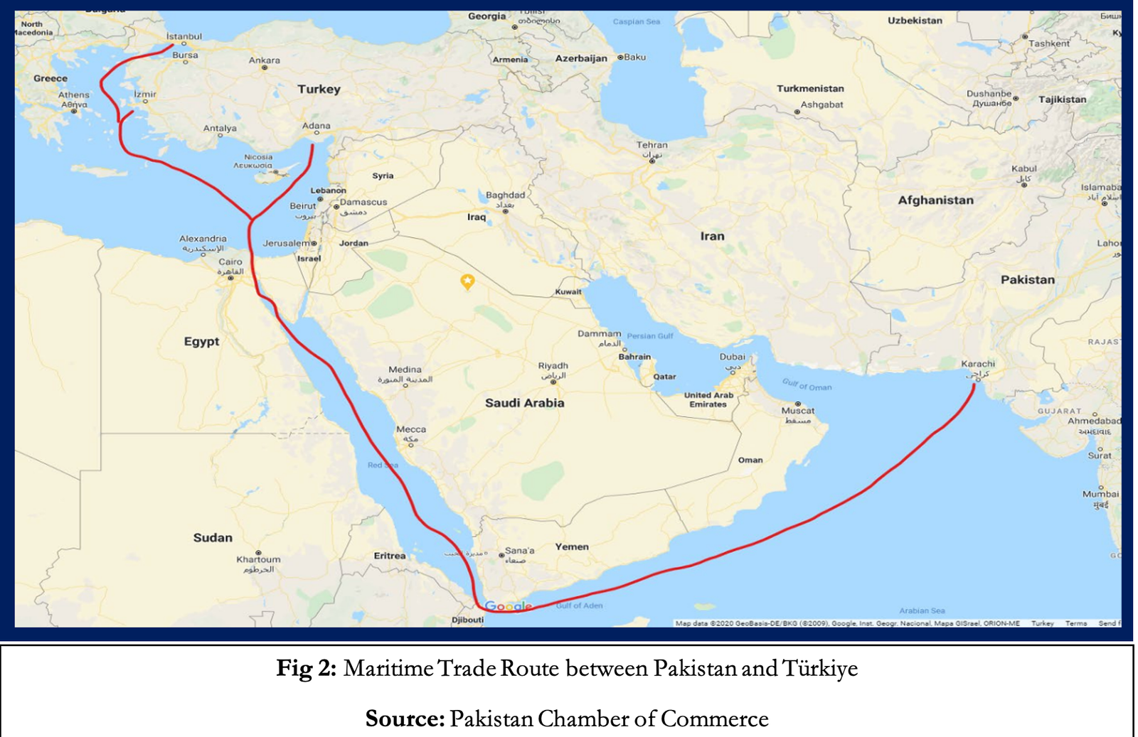 A major structural impediment to enhancing trade is the absence of a direct shipping and logistical route between the two countries.[57] As shown in Figure 2, maritime trade currently requires goods to transit through two critical chokepoints— the Suez Canal and the Bab-el-Mandeb Strait— rendering it highly susceptible to broader geopolitical disruptions. This lack of logistical connectivity, combined with underdeveloped economic ties, continues to constrain the emergence of a more durable and strategic political alliance between Pakistan and Türkiye.